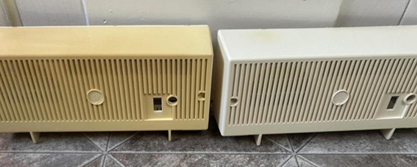 I spent a lot of time restoring the cabinet. To remove all the plastic yellowing, I learned to retrobright—which is really just hydrogen peroxide plus sunlight. It is a pretty cool technique common for collectors of old Nintendo's, sneakers, and such to restore their original colors. You can see below a case I retrobrighted (Right) next to one that still has 75 years of UV yellowing (Left).