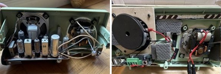 I had this idea of taking good looking old classic radios and rebuilding them with modern components. Seems a lot cooler than a commercial Bluetooth shelf speaker, if you ask me. So I bought a 1959 Motorola 5C14GW because I loved the mid-century look. I actually bought two and picked up a few other stereos that were older, but the Motorola ended up being the one I liked most. Maybe they will be future projects. The plan was to keep the exterior looks, the Telechron clock movement, replace the radio guts, and make it safe and serviceable. I started by tossing the old tube circuitry and speaker. Sacrilegious! To some, I am sure. But this was a common mass-produced radio and I felt fine about it. The tube chassis, the old mains harness, and the line caps all came out so I had a clean start.