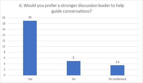 In summary, the need for some additional structure, participation guidelines, and lite moderation was a common theme from responses across several questions. Actions that foster inclusivity would make this a safe and welcoming environment for all participants. Leadership discussions are currently underway to identify optimum next steps. Stay tuned for more information on Happy Hour 2.0.