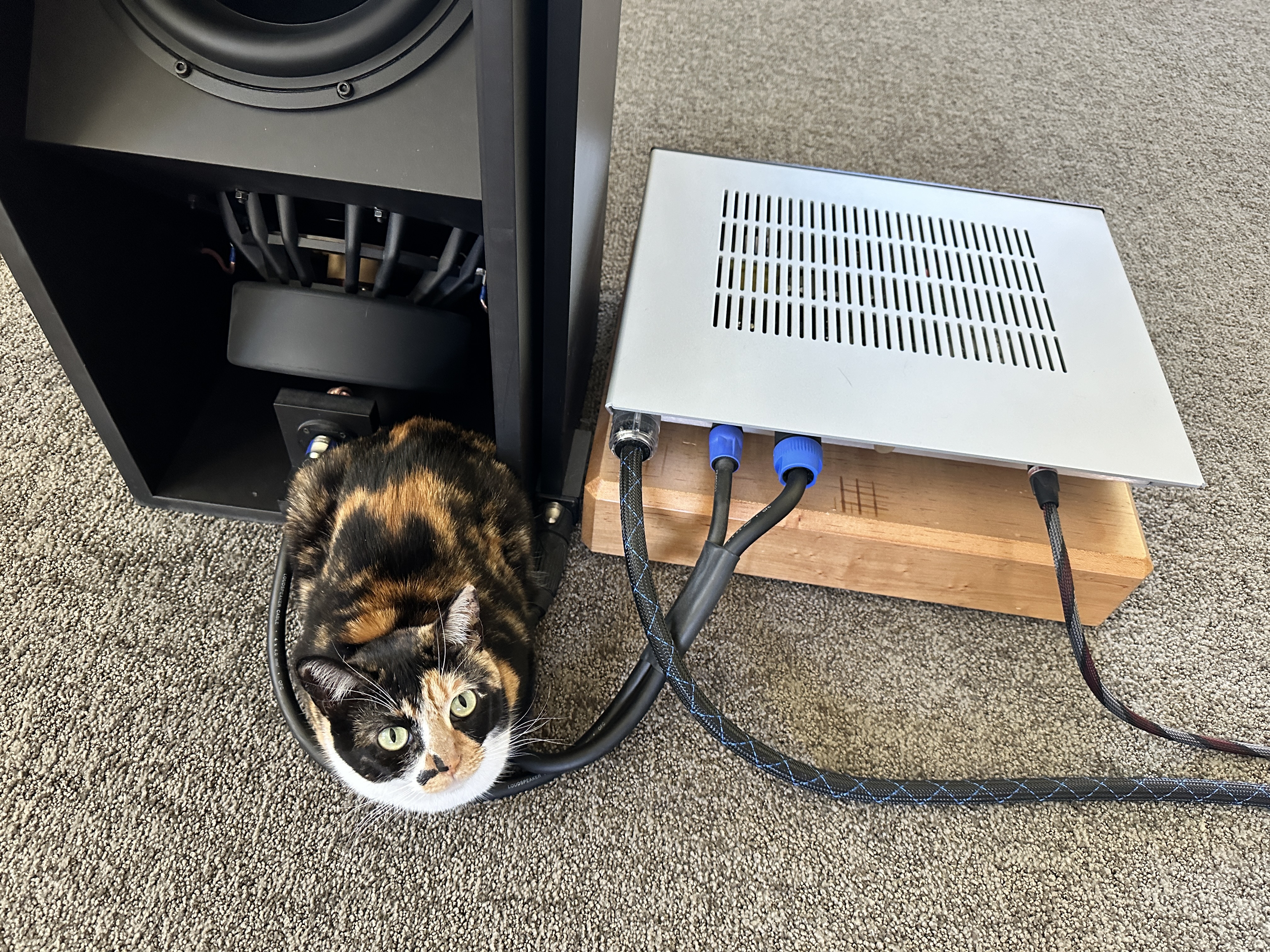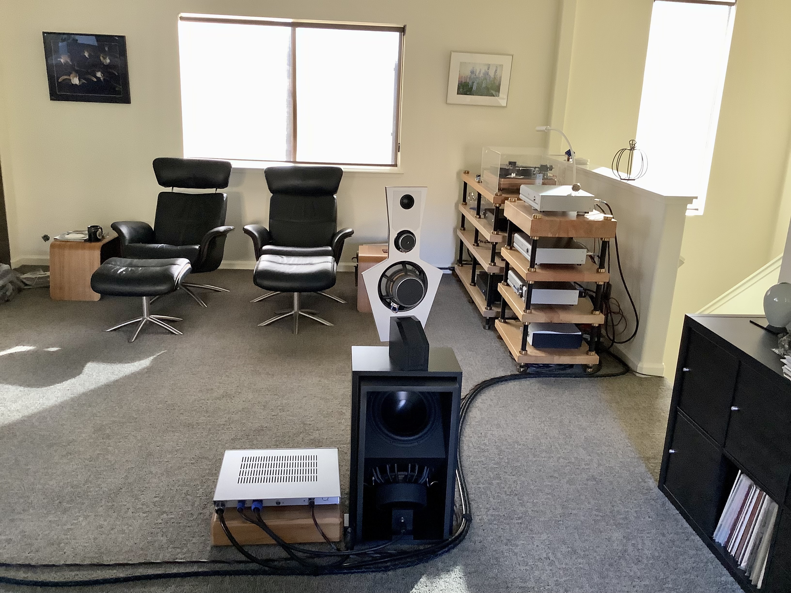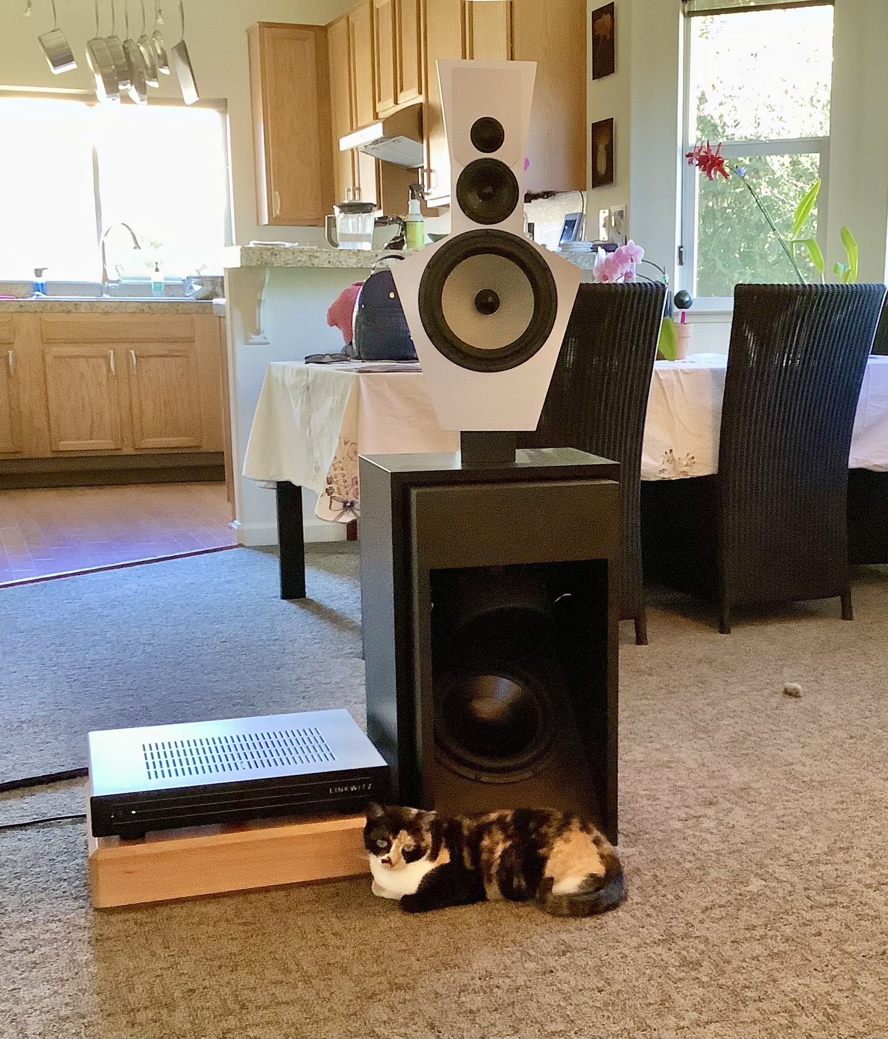 Linkwitz 521.4 with Linkwitz amps, cables, and analog crossover. Purchased from Frank Brenner (linkwitz.store) in Germany in Feb 2022. Aluminum/panzerholz baffles. Black bridge and woofers. Linkwitz amps with 5 amps per channel and analog crossover. Speaker cables with Speakon connections.