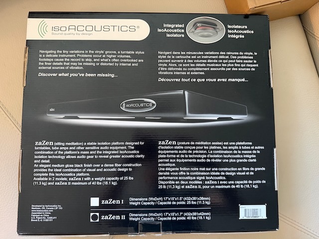 IsoAcoustics zaZen 2 Isolation Platform 17" W x 15" D, up to 40 lbs. component. Great for turntable, CD player, or other isolation. Like new in box.